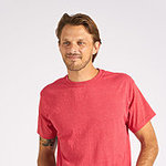 5.0 oz., 100% cotton pre-shrunk jersey 23 singles Taped neck and shoulders 1x1 rib collar with double needle coverstitching on front neck Double-needle sleeve and bottom hems Quarter-turned to eliminate center crease Tear away label USMCA certified Note: Athletic Heather is 90% cotton/10% polyester. Dark Heather, Navy Heather, Red Heather, Light Blue Heather, Safety Green and Safety Orange are 50% cotton/50% polyester.