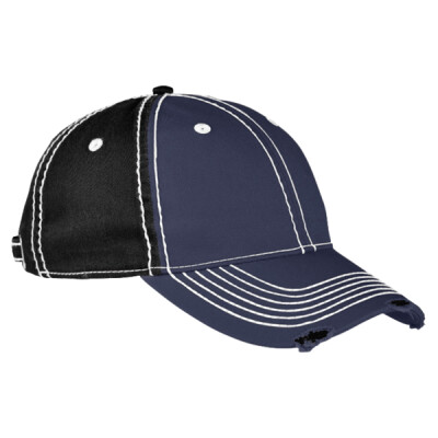 100% cotton twill with contrasting back panels; Heavy enzyme wash; 6-panel; Unstructured; Low-profile; Self fabric top button matches back panel color; Self fabric closure with silver sliding buckle and tuck in tunnel; Eyelets match heavy contrast stitching; Heavy raised white contrast color stitching; Pre-curved visor with heavy distressing;