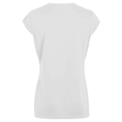 100% polyester wicking smooth knit * Wicks Moisture * Odor resistant * Ladies' fit * Tag-free label * V-neck collar * Contrast color collar and princess seams * Set-in cap sleeves