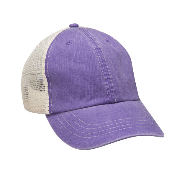100% cotton front panel and visor; 100% nylon mesh back panel; 6-panel, unstructured, low-profile, pre-curved visor; Pigment-dyed front panels with contrast stitiching (matches back panels); Traditional tan nylon mesh back panels; Self fabric strap with adjustable antique brass slider back closure; Four-row stitching on visor;