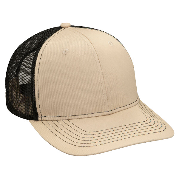 65% polyester, 35% cotton crown and visor; 100% nylon contrast mesh back panels; 6-panel, structured, rounded, pro mid-profile; Slightly curved visor; Contrast stitching on visor and front panels, matches back panels; Back closure matches back panels; Eight rows of stitching on bill;
