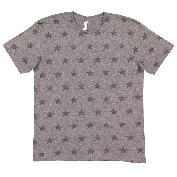 4.5 oz., 60% combed ringspun cotton, 40% polyester; Natural Heather is 100% combed ringspun cotton; Printed star vintage fine jersey; Topstitched ribbed collar; Self-fabric back neck tape; Double-needle sleeves and bottom hem; Side seam construction; EasyTear™ label; 2% of all Code Five™ sales are donated to children of Fallen Soldiers Relief Fund, Inc. and Fisher House™;