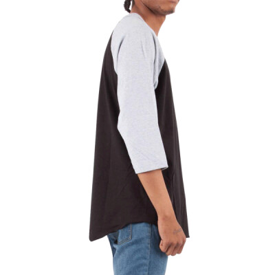 6 oz., 100% USA cotton, 18 singles; Heather Grey is 90% USA cotton/10% polyester; Charcoal Grey is 50% USA cotton/50% polyester; 1" double-needle stitched sleeve; Tear away label; Scalloped, merrowed bottom hem; Quarter-turned to eliminate center crease; Contrast raglan sleeves and neck binding;
