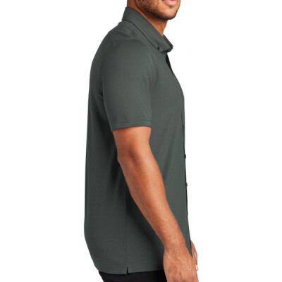 Combining the smart tailoring of a woven shirt with the movement and comfort of a soft knit, this shirt eases between night and day. The polished silhouette complements office wear, while the moisture-wicking fabric make it perfect for post-work play. A back yoke seam notched vent hem, and satin-finished buttons extend the contemporary profile.