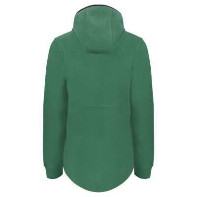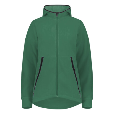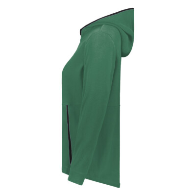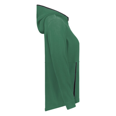* Eco-Revive product featuring 8 ounce, 70% recycled polyester/30% polyester * Ladies' fit * Hanger loop label * Full front zipper with zipper garage to keep elements out * 3-piece hood with spandex binding * Set-in sleeves * Front zippered pockets with spandex binding detail * Dual inside pockets * Self-fabric cuffs * Open bottom