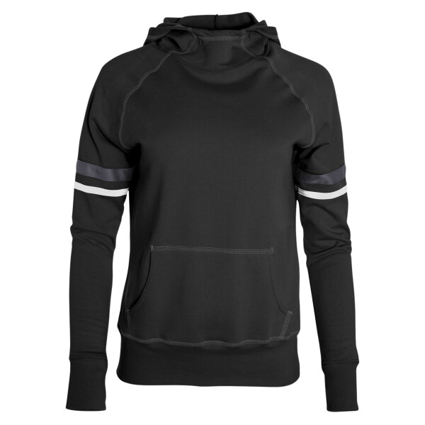 9 oz., 50% cotton/50% polyester smooth athletic fleece; Woven label; No drawcord on girls sizes; Contrast color three-needle coverstich; Raglan sleeves with contrast color sleeve stripes and thumbholes for warmth; Front pouch pocket; Rib-knit cuffs and bottom band;