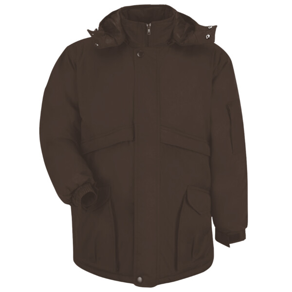 • Lined zip-off hood with drawstring, hidden knit storm cuffs and extended back prevent heat from escaping