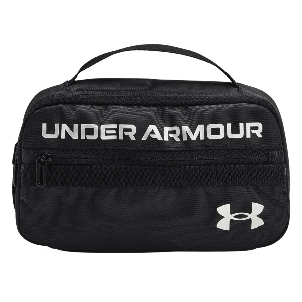 100% polyester; UA Storm technology delivers an element-battling, water-repellent and stain-repellent finish; Large main compartment fits toiletries with full length zipper so it can lay flat; Front dual-access pocket & large internal mesh pocket; Tough, PU-coated bottom & back panels for added durability; Dual-carry side & top strap construction for multiple ways to carry or hang-up; Dimensions: 3.7"W x 6.3"H x 9.8"L; Volume: 4 L;