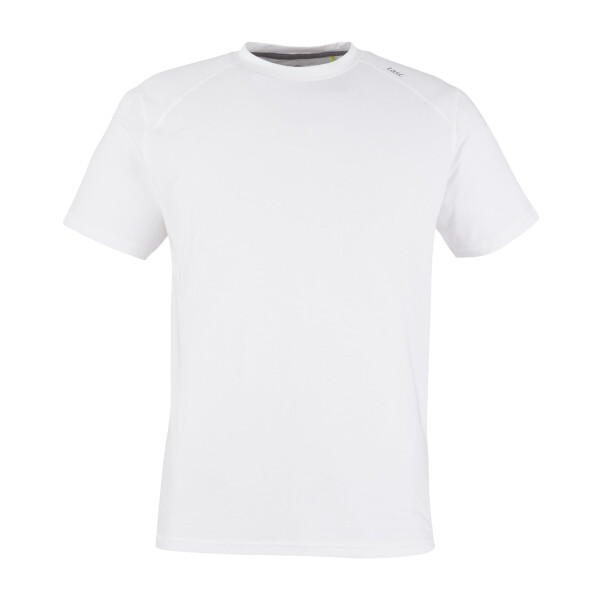 52% organic cotton, 43% bamboo viscose, 5% lycra® spandex, 160gsm single jersey; Moisture-wicking, UPF 50+, anti-odor; Made with organic cotton and renewable bio-degradable bamboo fibers ; Athletic coverstitch seams; Self collar tagless at inner neck; No top shoulder seam; Coverstitch raglan seams; Word mark logo along left raglan seam; Drop mark logo at upper center back under collar; Sewn in care and content label at lower left side seam; Relaxed fit; Fabric and garments are manufactured in a facility 100% powered by solar and wind energy. Fabric and garments are manufactured in a GreenCo certified facility. 450g of CO2 are saved with the production of each garment ;