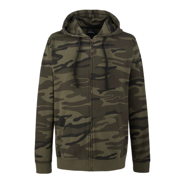 6.8 oz.; Green Camo: 100% cotton; Black Camo/Blk & Solid Blk: 70% cotton, 30% polyes@er; Enzyme washed; Black drawstring; Front pouch pockets; Rib bottom and cuffs; Nylon zipper;