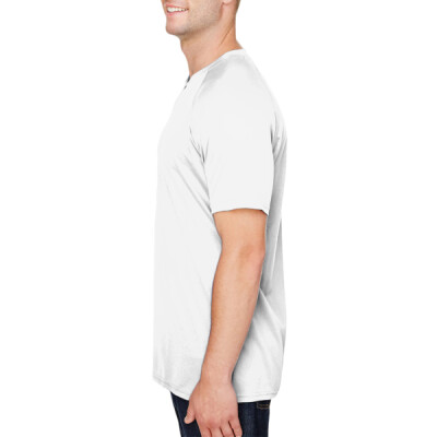Wicks moisture; 100% polyester; Wicking knit with true hue technology that helps prevent dye migration; 2-button jersey; Raglan sleeve;