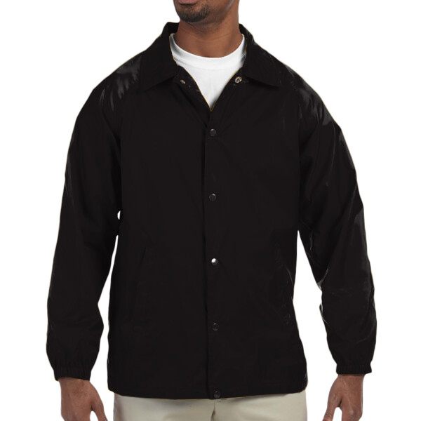 100% nylon taffeta; Wind- and water-resistant; Front welt pockets; Raglan sleeves with full elastic openings; Snap center front opening and open-bottom hem finish; InconspicuZip™ on inside for easy embroidery access; Heather Grey jersey lining (Sunray Yellow lined in White);